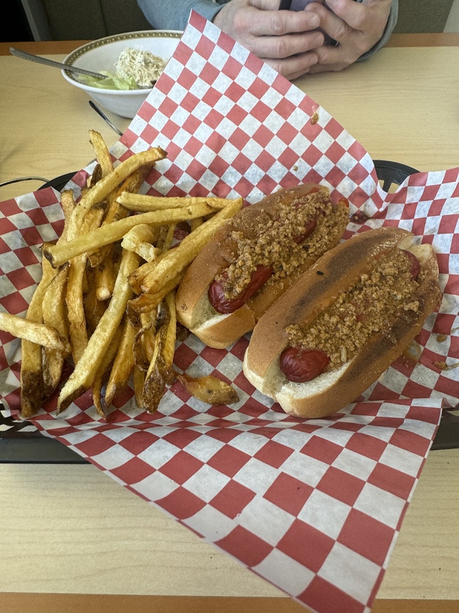 Just a small town meat and three buffet with sandwiches on the menu . The people here are awesome , friendly and inviting . The food is hot and fresh and very tasty. I had a side of macaroni and cheese off the buffet and the portion size was huge and it was delicious . I also had chili dogs and fries … the buns were toasted , the chili tasty , the fries hot . My wife had a scoop of chicken salad on a bed of lettuce and tomato , and she said it was really good . Not only was the food fantastic and the people friendly , but the price was very reasonable as well . Recommended !